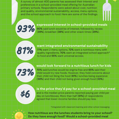 “A survey of almost 400 parents has assessed their interest and preferences in a school-provided meal offering for Australian primary schools. Respondents were asked about cost, nutrition and quality, environmental sustainability, access, menu options, and the school approach to food. Here are some of the findings.