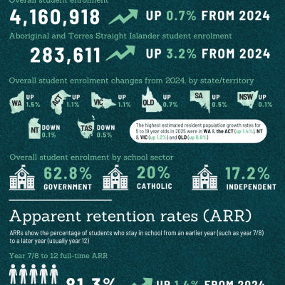 “The Australian Bureau of Statistics release data on schools and students in Australia each year. The latest data for 2025 show increases in student enrolment and retention. Find out more in this infographic.