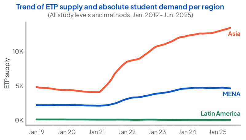 “A new report from Studyportals and the British Council, “ Asia, Latin America, and MENA in global education ,” demonstrates the continued rise of study abroad destinations outside of the Big Four anglophone countries. Of the three featured regions, Asia is an especially notable hub of consolidated supply (especially of English-taught programmes) and student demand. The report’s introduction notes that “regions that were once seen primarily as sources of outbound demand are now positioning themselves as destinations in their own right.” We can see that in international education strategies, rising foreign enrolments, and growth targets in countries such as Japan and South Korea. A key strength for Asia is that it now collectively offers 20,000 English-taught programmes (ETPs), which allows Asian institutions to: Attract demand from students who might otherwise be deterred by language barriers; Compete more effectively with the Big Four destinations. Asia’s rise as a regional destination correlates with increased supply of ETPs. Source: Studyportals/British Council In addition, Asia (1) hosts the most transnational campuses and partnerships of any region, and (2) now has almost 600 institutions in the major world university rankings. Number of TNE institutions and volume of student demand to study at a TNE institution, per region. On-campus bachelor’s and master’s, January 2019–June 2025. Source: Studyportals/British Council Taken together, this means that Asia is highly competitive on many fronts, including: Proximity to key regional source markets; Expanding work rights; Lower tuition and living costs; Highly ranked institutions; English-language programmes. As the report notes, these attractions are perfectly timed for “students who are increasingly weighing value-for-money, online/blended learning, and clear career pathways in their decision-making.” It is not coincidental that as countries such as China, Japan, Taiwan, South Korea, and Malaysia gain Asian enrolments, Australia, Canada, the UK, and US are losing traction in many Asian markets. Top origin markets for Asian destinations include India, Pakistan, Bangladesh, and several others. Demand by level Of Asian destinations, Japan and China are attracting most student interest, as demonstrated in Studyportals pageviews. Japan is the leader for master’s degrees, while Chinese bachelor’s programmes are rapidly gaining interest (+33% between 2023 and 2025). Vietnam has also gained share of student demand, up 101% for bachelor’s programmes. However, demand has weakened over the past couple of years for Singapore and South Korea. Supply dynamics Changes in supply on English-taught programmes (ETPs) can be signals of a destination’s ambition of becoming a study hub. For example, India expanded its supply of both bachelor’s (+54%) and master’s programmes (+53%) between 2023 and 2025. Its international enrolment target is 200,000 by 2030, up from just over 72,000 right now. Other countries increasing their ETP supply include Singapore, Sri Lanka, and Brunei. Important source markets Across Asia, the most important sources of students for bachelor’s programmes include Bangladesh, India, and Pakistan, which the report says, “underscores the pull of regional proximity, affordability, and growing ETP availability across Asia.” At the master’s level, demand is most pronounced from India, but growth in demand is highest in Bangladesh and Pakistan. Along with Asian students, US students are among the top 5 in terms of searches on Studyportals websites. Other non-Asian countries demonstrating interest include UAE (bachelor’s) Nigeria (both levels), UK (master’s), and Türkiye (master’s). Source: Studyportals/British Council Most popular programmes As in other destinations, students are gravitating to STEM studies. Demand for these programmes offered in Asia outpaces supply. Other disciplines could stand to attract more students. Student pageviews per programme offered in Asia. Source: Source: Studyportals/British Council Regional perspective The Studyportals/British Council report considers “Asia to be a consolidated destination, MENA as having policy-driven momentum, and Latin America having a more cautious trajectory.” These regions, as well as Europe, are increasingly on the radar of the world’s international students. The report concludes: “This continuous recalibration is redrawing the map of international education and raising important questions about how institutions and governments can remain competitive.” For additional information, please see: “ Canada and India deepen educational ties; India repositions as an equal player in international education ” “ Inbound, outbound, and transnational: the landscape for international education in China continues to evolve ” “ Japan surpassed its foreign enrolment target of 400,000 in 2025 ” The post Supply and demand for international higher education increasingly aligned in Asia appeared first on ICEF Monitor - Market intelligence for international student recruitment .